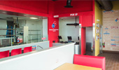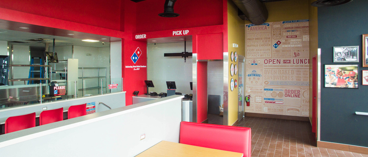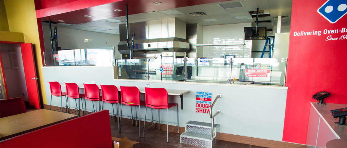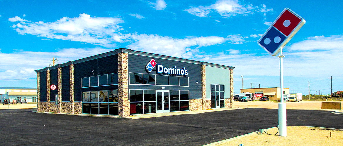 FEHRS constructed this single-story building with a metal roof and r-panel back wall for a Domino's Pizza franchise in west Texas. It features a dining room with an open ceiling concept showing exposed ducting, rafters, etc. painted black, wood-grain tile flooring throughout and ADA-compliant bathrooms with tiled walls and floors. The fully-functional kitchen has FRP paneling and tile walls, coated ceiling tiles, stainless steel fixtures throughout, an LG double-stacked pizza oven with stainless steel backing, a commercial-sized reverse-osmosis water unit and tankless water heaters. The project was finished with veneer stone, EFIS and composite wood siding, minimal rock/natural landscaping, lighted signage on the building and street and a drive-thru window.
