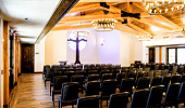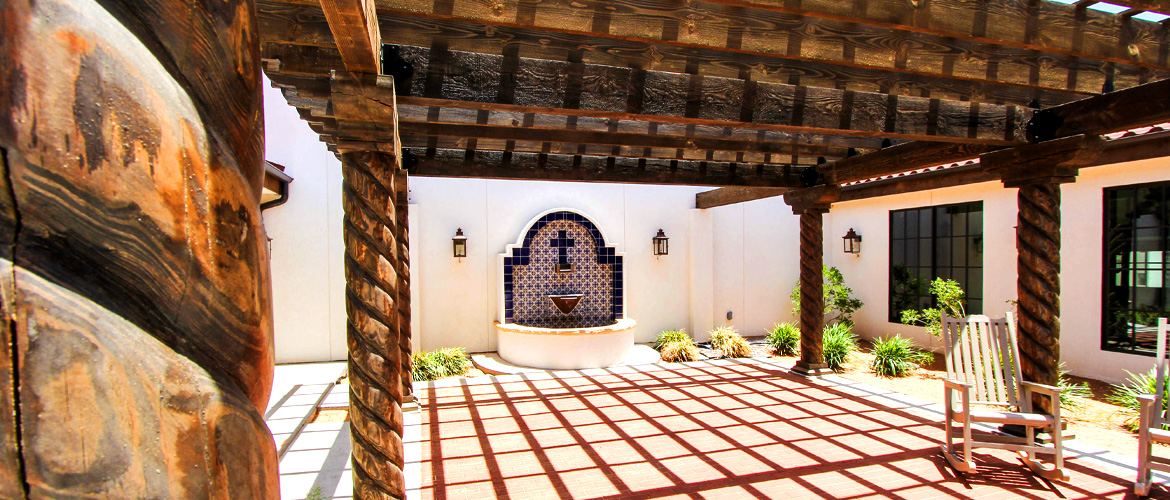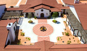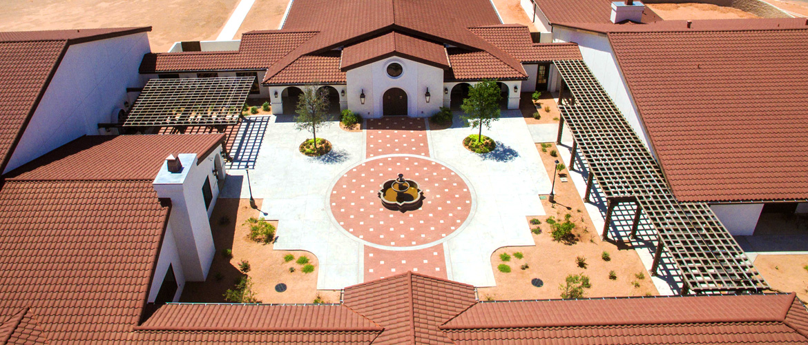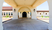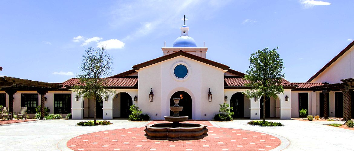 | Project Highlights: | Spanish Mission Theme Decra Tile Roofing Copper-Finished Gas Lanterns Dome & Cupola w/Cross Stained-Glass Windows Vaulted Chapel Ceiling |