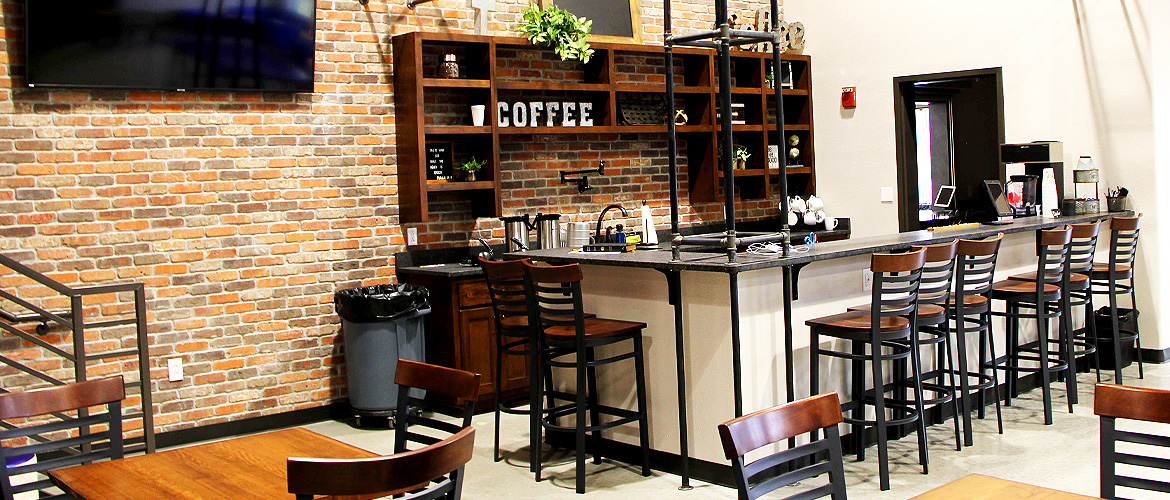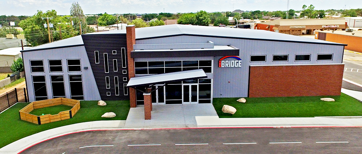 The FBC Andrews - The Bridge - project features a structure composed of flat and ribbed architectural panels and brick topped with a metal roof. The exterior is completed with an astroturf and rock landscape, paved parking, concrete sidewalks and aluminum wrought-iron fencing. The interior consists of a large gymnasium, a spacious common area and a worship center. The gym contains two basketball goals with electric lifts, a complete speakers system with digital scoreboard, recessed volleyball net poles, portable aluminum bleachers and a Kal Wall Window (skylight-type wall). The worship area features a large room with a sizeable stage, an a/v booth, lighting and audio systems, an open-structure ceiling with fabric-covered ducting and a coffee bar area with seating a brick wall. The common area has a small kitchen with food prep area, six carpeted classrooms with roll-up doors and partitions, an upstairs lounge and metal powder-coated stairs.