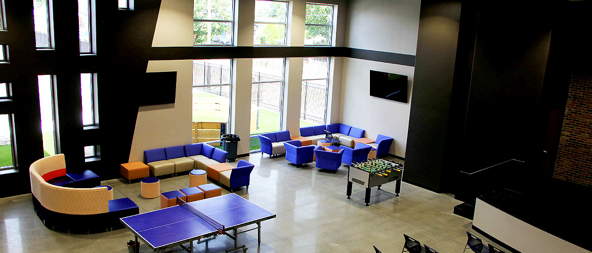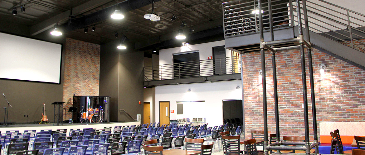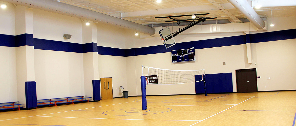| Project Highlights: | Full Basketball Court Digital Scoreboard Kal Wall Window Gerflor Flooring Diamond-Polished Concrete Floor Large Stage with Audio/Lighting Systems |