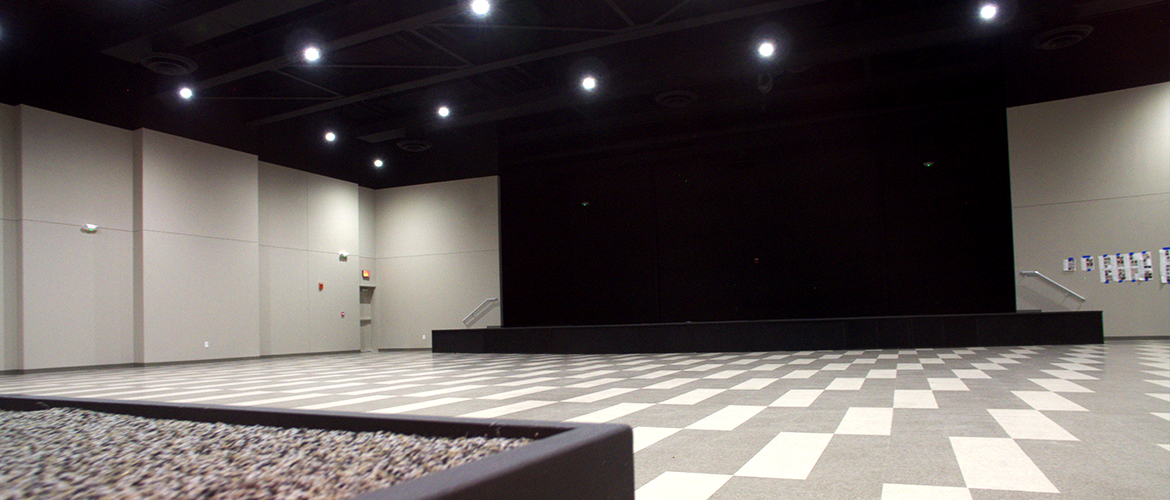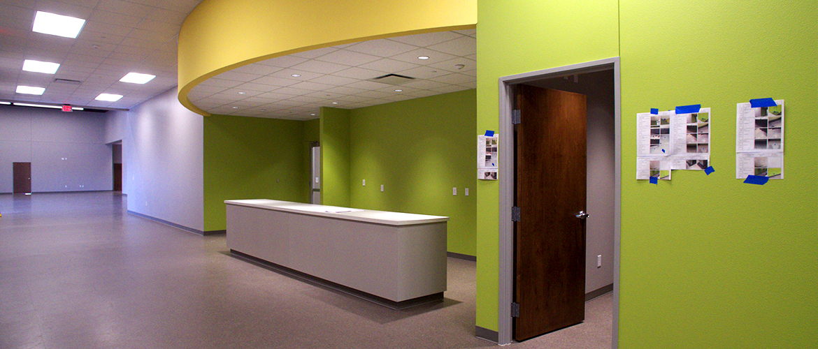 The interior of the building was completely gutted to allow for a clean slate. The lobby is outfitted with VCT flooring, long rounded corner walls and partial exposed ceilings. The worship center includes custom-designed carpet tile, a concrete stage, exposed ceilings and acoustical panel stage backing. The rest of the interior is set up with 16 sunday school rooms with a dedicated lobby featuring a custom reception desk and ceiling arches, 11 ADA-compliant bathrooms and a kitchen with custom cabinets and counters.