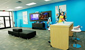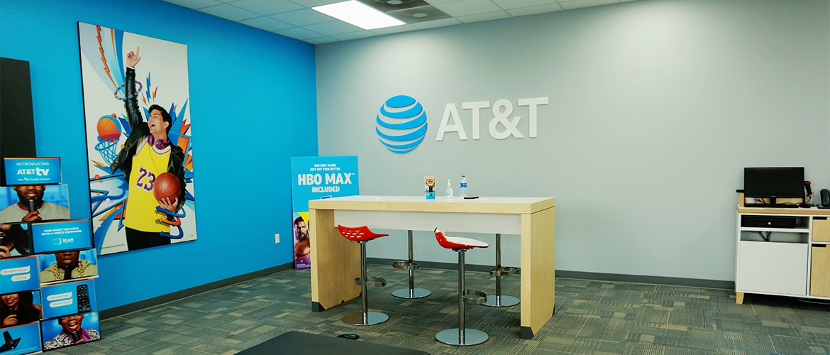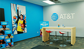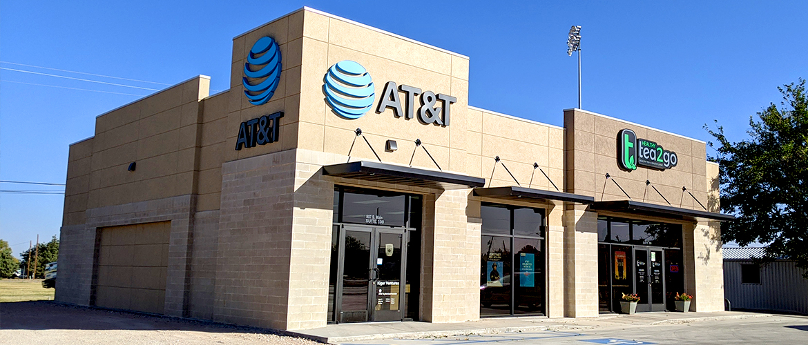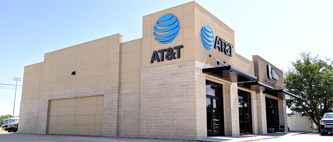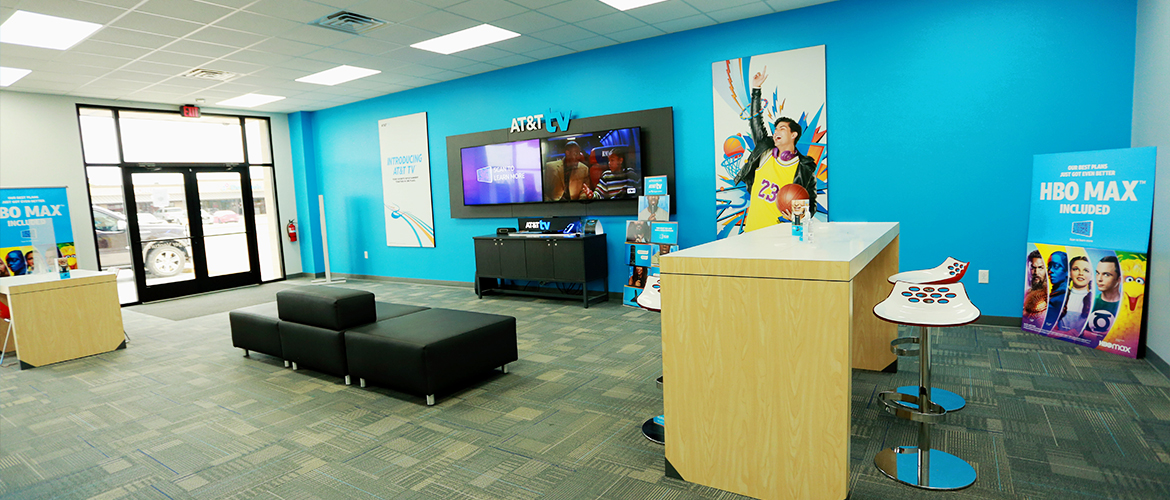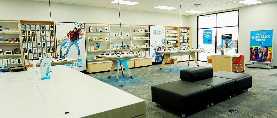 The AT&T-Seminole project is half of a commercial storefront that features a rock and stucco exterior with custom metal canopies over the windows and doors and a concrete parking lot. The interior design displays custom-painted walls with an accent wall and 10ft. ceilings. Carpet flooring is laid throughout the store.