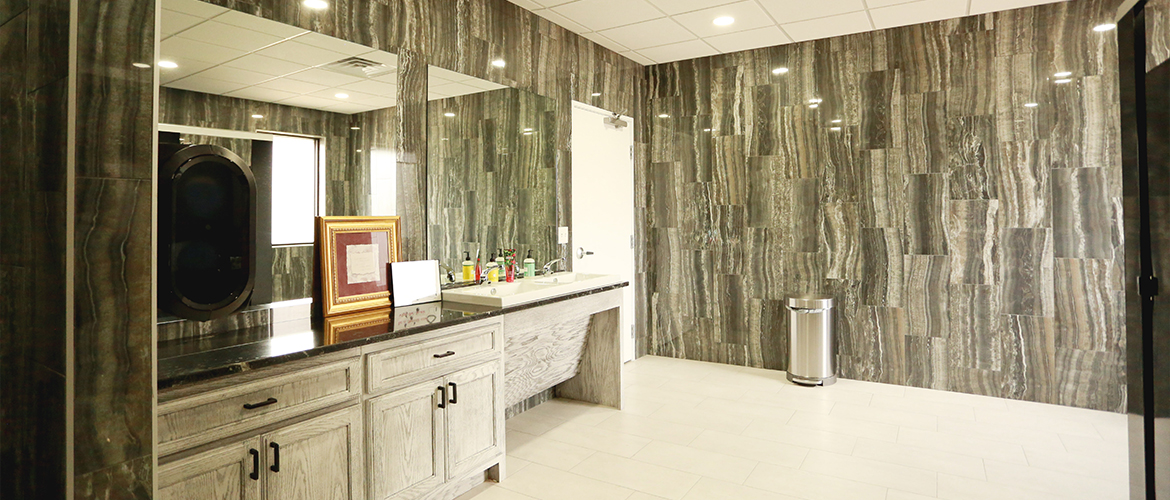 | Project Highlights: | Complete Demo & Remodel Marble Tile Built-In Trophy Case Custom Counters Custom Cubicles Whitewashed Vanities Glazed Concrete Flooring |