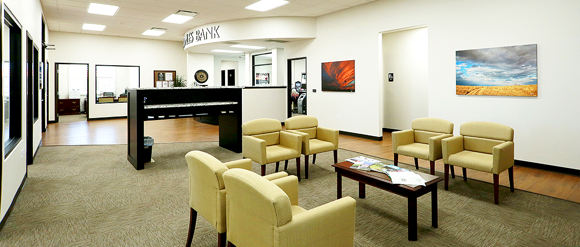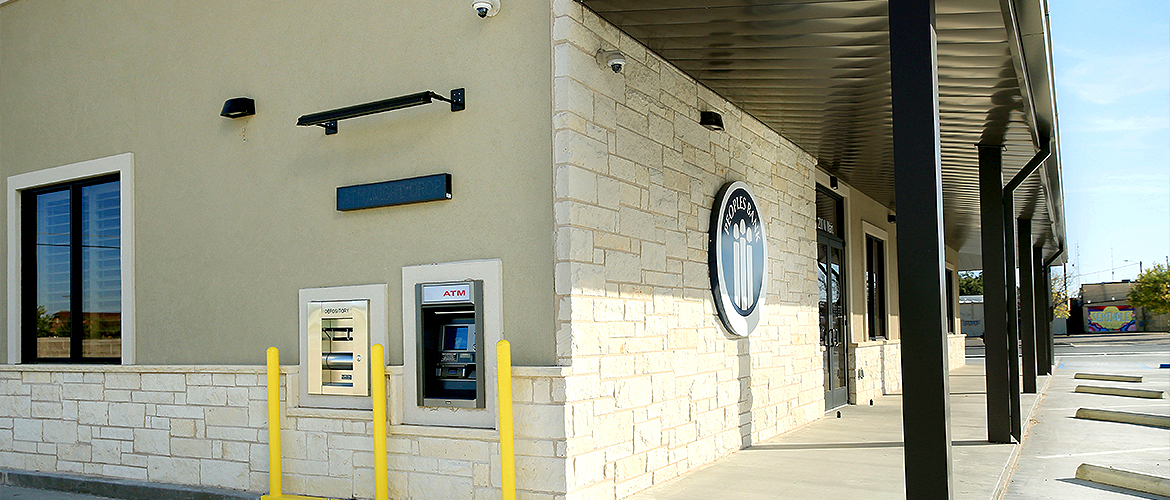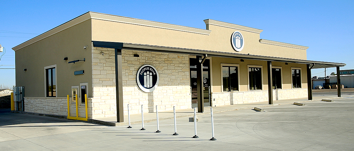 The Peoples Bank - Seminole building project is a steel structure building with a standing seam roof and metal stud exterior walls insulated with six inches of open cell foam insulation. Beautiful Austin stone and EIFS exterior wall finishes make the wrap-around porch stand out with dark bronze architectural soffit panels and standing seam roof panels. Included is a four-lane drive through with 3 being covered by gables roof structure. The interior draws attention with a curved soffit for signage above the black wood curved reception desk with Peoples Bank logo etched into glass behind. The reception desk, banking areas and kitchen cabinets are all topped with granite countertops. The floor in the lobby features a Florida-Tile Berkshire tile (rich colored and hand-scraped texture ceramic tile designed to look like wood) that transitions to a beautiful Patcraft carpet laid in 1/4 turn pattern in the waiting areas and offices.
