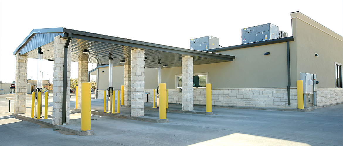 | Project Highlights: | Wrap-Around Porch Concrete Parking Lot Textured Cinderblock Fence Curved Interior Soffit with Signage |