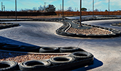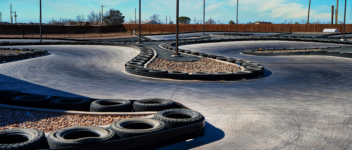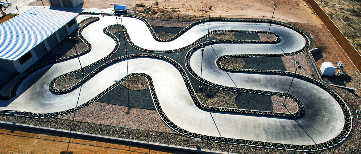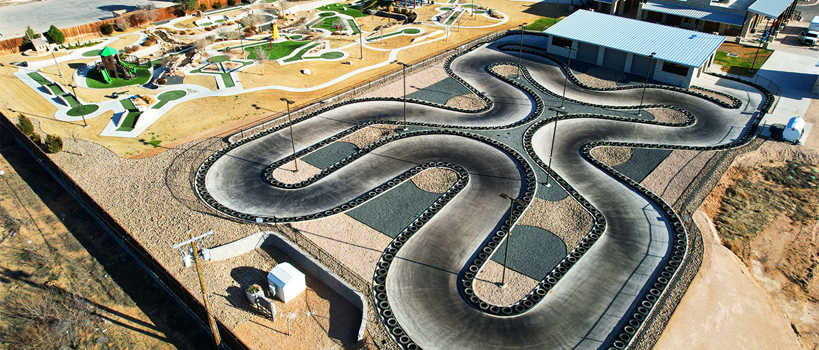 The Green Acres Mini Golf - GoKart Addition is a continuing partnership with Green Acres Mini Golf featuring two additional buildings and a 25,000+ ft.2 concrete go kart track with curb and gutter. The track also features tires and iron barriers on the outer and inner perimeter of the entire track. The track also utilizes 30' light poles equipped with energy-saving LED lighting kits. A complete 10-catch basin system ensures proper drainage to keep the track dry. The pit building is wrapped in natural stone and is outfitted with efficient HVLS fans for cooling.