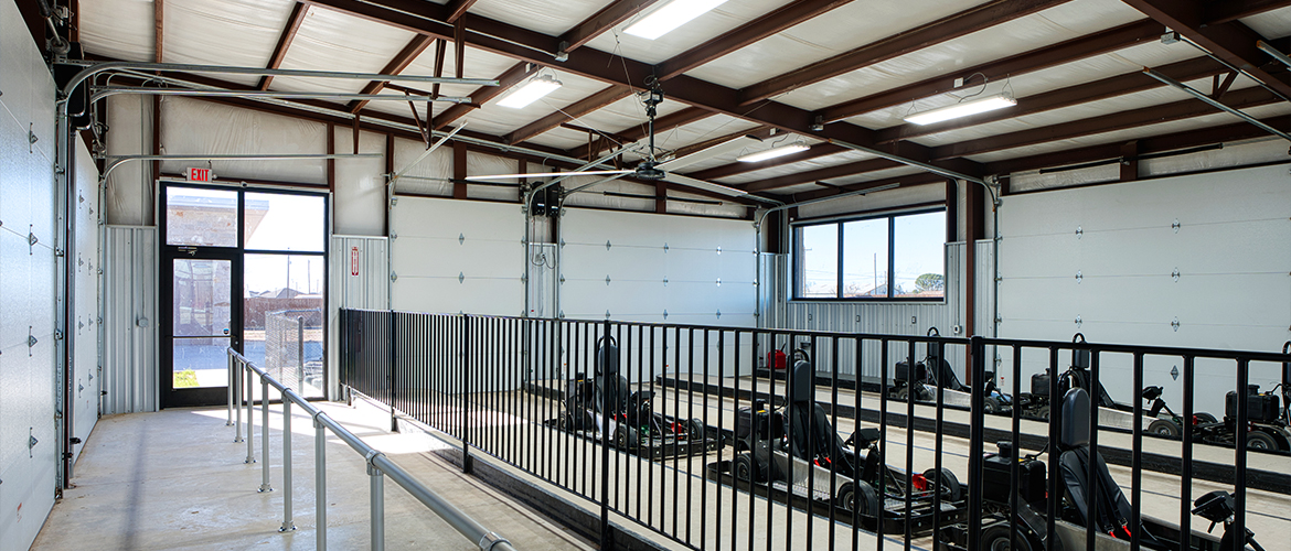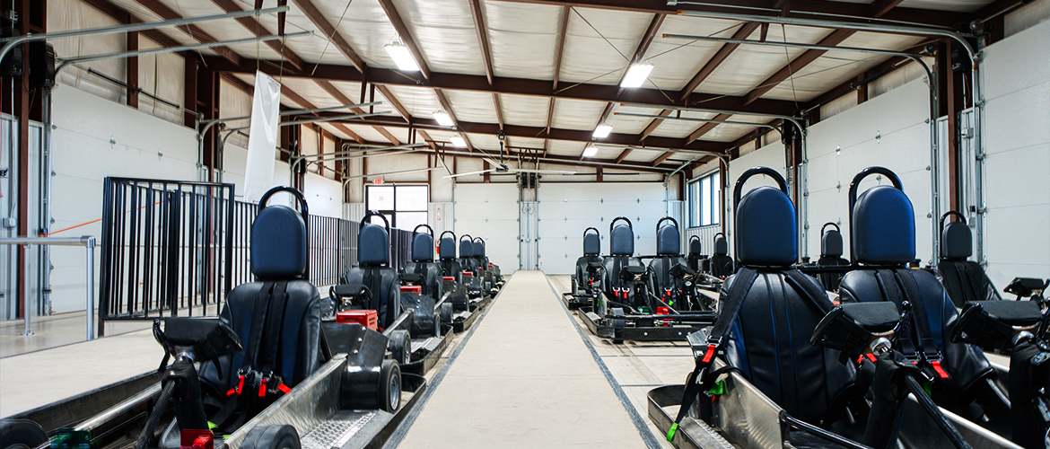 | Project Highlights: | 25,000+ ft.2 of Go Kart Track Natural Stone Exterior Track Drainage System HVLS Fans Standing Seam Roof LED Track Lighting |
