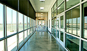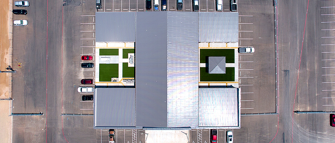 Outside, the main building boasts two courtyards finished with concrete sidewalks and turf including a small pavilion. The exterior features EFIS, horizontal metal panels and veneer rock. The parking lot is finished with hot mix asphalt and steel pole lighting.