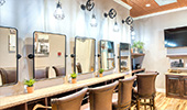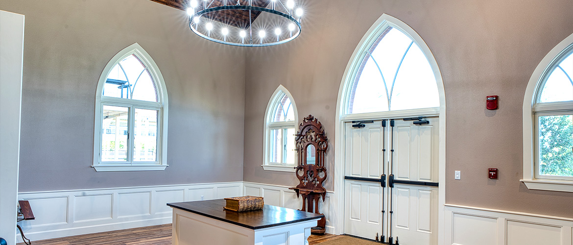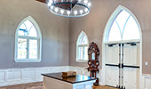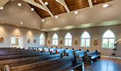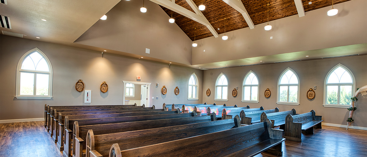 The chapel exhibits a stunning stained wood ceiling and solid wood floors throughout. Peaked windows surround the exterior and elegant LED lighting is installed to offer a beautiful ambiance. It also hosts a classic groom's dressing room with plenty of space for groomsmen. A very traditional chapel with wooden pews and a beautiful altar completes the look.